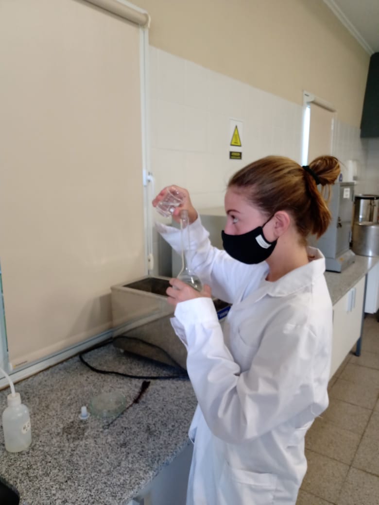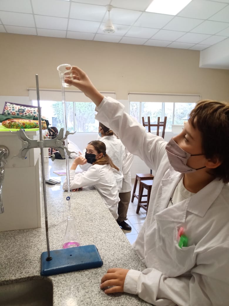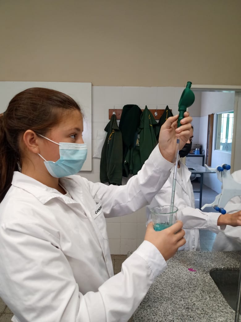 Alumnos de 1º Año BIO, familiarizándose con el uso de elementos de laboratorio. Titulación ácido-base en el trayecto Bioseguridad y técnicas básicas.
